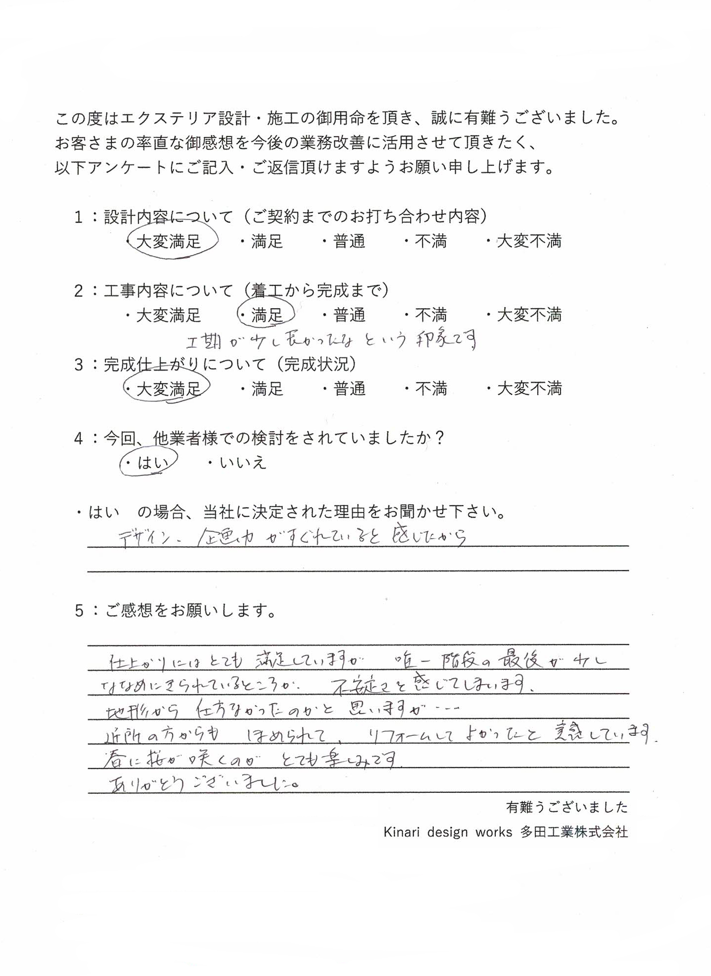 千葉 習志野市にて、ファサードとお庭のエクステリアリフォームが完成しました。 デザイン、企画力がすぐれていると感じたので決定しました。 工期が少し長かったなという印象です。 仕上がりにはとても満足していますが、唯一階段の最後が少しななめにきられているところが不安定さを感じてしまいます。 地形から仕方なかったのかと思いますが、、、 近所の方からもほめられて、リフォームしてよかったと実感しています。 春に桜が咲くのがとても楽しみです。 ありがとうございました。